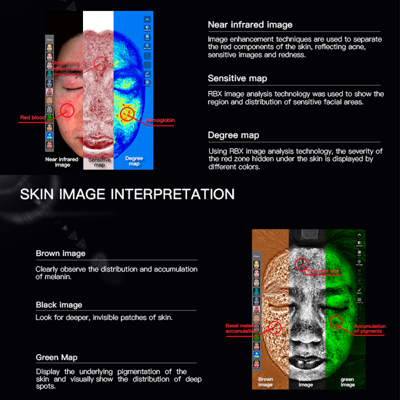 Personalized Insights: By analyzing the unique characteristics of each person's skin, the analyzer generates personalized reports that identify specific skin issues and provide tailored recommendations for skin care routines and products.